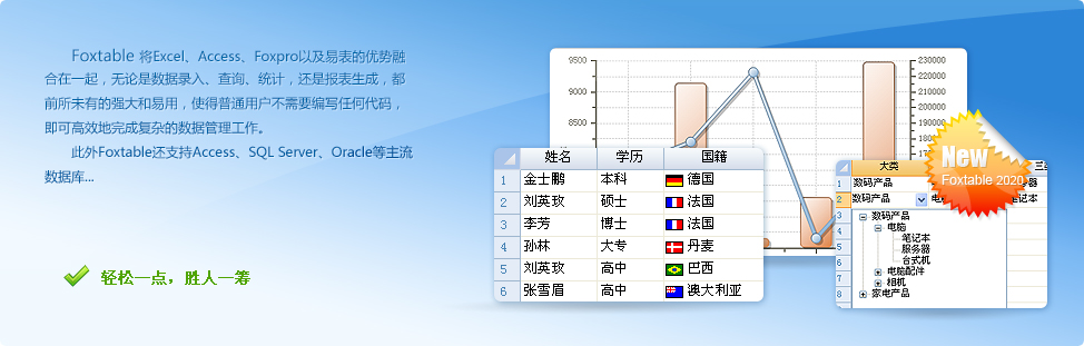 如果有人告訴你,有這樣一款軟件,不管你有沒有基礎,只需一周左右的時間就能讓你成為一個數據管理高手,而且其數據錄入之快捷、統計查詢之強大、報表輸出之多樣,目前市面上的軟件無出其右;同時只要你愿意,它可以立即變身為一個開發平臺,而且從PC到手機、從C/S到B/S、從客戶端到服務端、從單機到局域網再到互聯網、從常規的數據管理到文檔管理、從單業務管理系統到企業整套ERP,包括企業IM,它都能勝任開發,并且可以編譯成獨立的可執行文件。它不僅簡單,而且高效,高效到一人可抵一個小團隊;它能讓一個完全沒有接觸過編程的職場菜鳥,在3個月甚至更短的時間內蛻變為一個管理軟件開發的全棧工程師。你可能不會相信,真的有這樣的軟件嗎?有,就是Foxtable!Foxtable將Excel、Access、Foxpro、VB以及易表的優勢融合在一起,無論是數據錄入、查詢、統計,還是報表生成,都前所未有的強大和易用,普通用戶無需編寫任何代碼,即可輕松完成復雜的數據管理工作,真正做到拿來即用。同時Foxtable又是一個高效開發工具,專門針對數據管理軟件的開發作了大量的優化,使得用戶在開發過程中只需關注商業邏輯, 無需糾纏于具體功能的實現,這樣Foxtable不僅開發效率十倍于其他專業開發工具,而且更加易用,幾乎人人都能掌握。讓普通人開發出專業水準的管理軟件,以前是一個不可思議的想法,而Foxtable的出現,讓這成為現實。而且Foxtable內置了HTTP服務和手機網頁生成功能,用戶不需要任何專業知識,甚至可以完全不懂網頁設計,也能快速開發出手機端的管理軟件。此外,Foxtable不僅內建數據庫,還支持Access、SQL Server、Oracle等主流數據庫作為外部數據源,并提供了數據動態加載、后臺統計等功能,使得相距千里的不同電腦協同處理數據,以及海量數據管理,非專業人士也能輕松應付,從而讓普通人也能快速開發出各種基于互聯網的管理系統,如進銷存、MRP、ERP、OA、CRM、SCM、MIS系統等等。不僅如此,FoxTable還同時具備B/S和C/S架構的優勢,可以像B/S軟件一樣易于部署,同時又具備C/S軟件良好的用戶體驗和交互性。經過十年的發展,目前國內已經有數萬企事業單位成功利用Foxtable自行開發管理系統,不再受制于軟件公司,不少單位節省了以十萬甚至百萬計算的費用;同時也發展了一大批個人愛好者,這些愛好者很多都是企業管理人員,熟悉管理和業務邏輯,以前苦于沒有合適的開發工具,無法根據自己的需要自行開發系統,Foxtable的出現,讓他們如虎添翼,紛紛開發出適合自己企業的管理軟件,讓領導和同事刮目相看,大大提高了自己在職場的競爭實力,一些用戶因此改變了自己的職業生涯甚至人生。 [ + 展開 ]